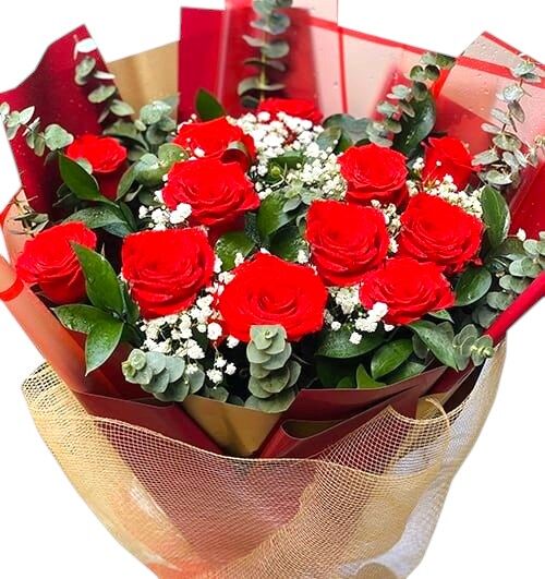 Included: a dozen of red rose with baby’s breath, eucalyptus and greenery with fancy wrapping paper.