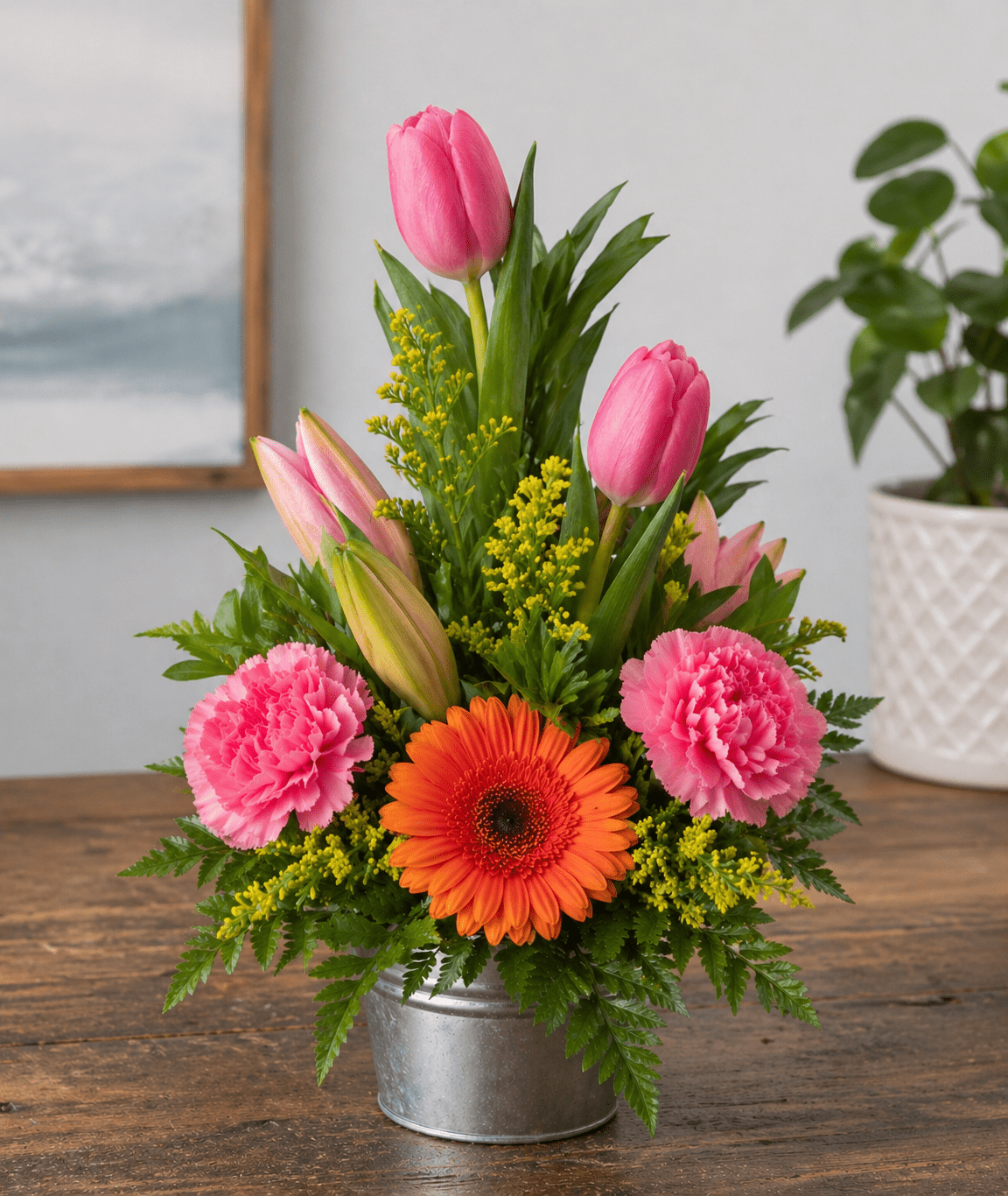 Included: 1 stem of gerbera daisy, 2 stems of tulip, 2 stems of carnation, 2 stems of asiatic lily, solidago and greenery in a metal container.