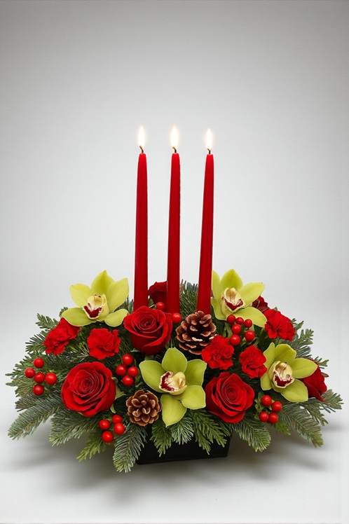 Included: 6 stems red rose, 8 stems red carnation,4 mini cymbidium orchid blooms, 6 stems red hypericum berry, Christmas decoration and 3 red candles in a centerpiece.