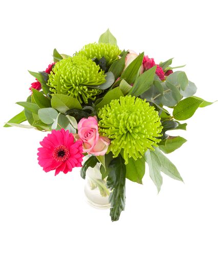 A beautiful bouquet and tell them how you feel without saying a word. Includes : Clear Vase, Greens, Rose, Spider Mum, Gerbera.
