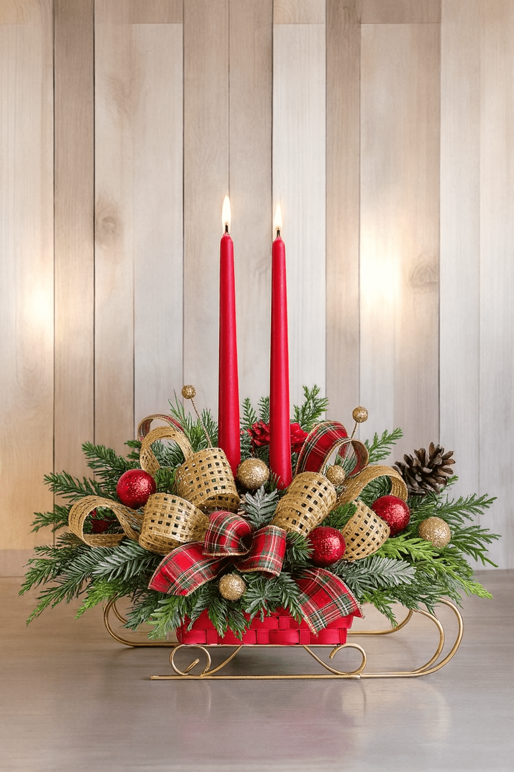 Included: Mixed winter greenery, Christmas decoration, 2 red candles in a Christmas sleigh ( no fresh flowers )