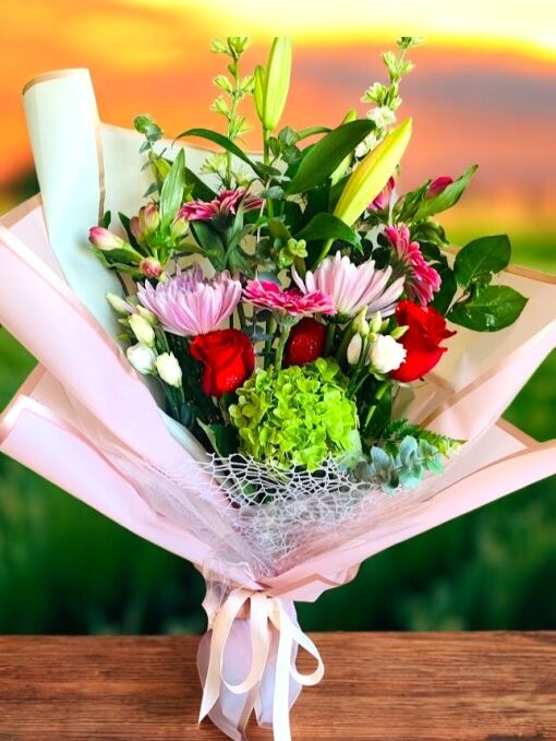 Included: Asiatic lily, mini gerbera daisy, red rose, alstroemeria, mini green hydrangea, larkspur, lisianthus, spider mum, filler and greenery in fancy wrapping papers.