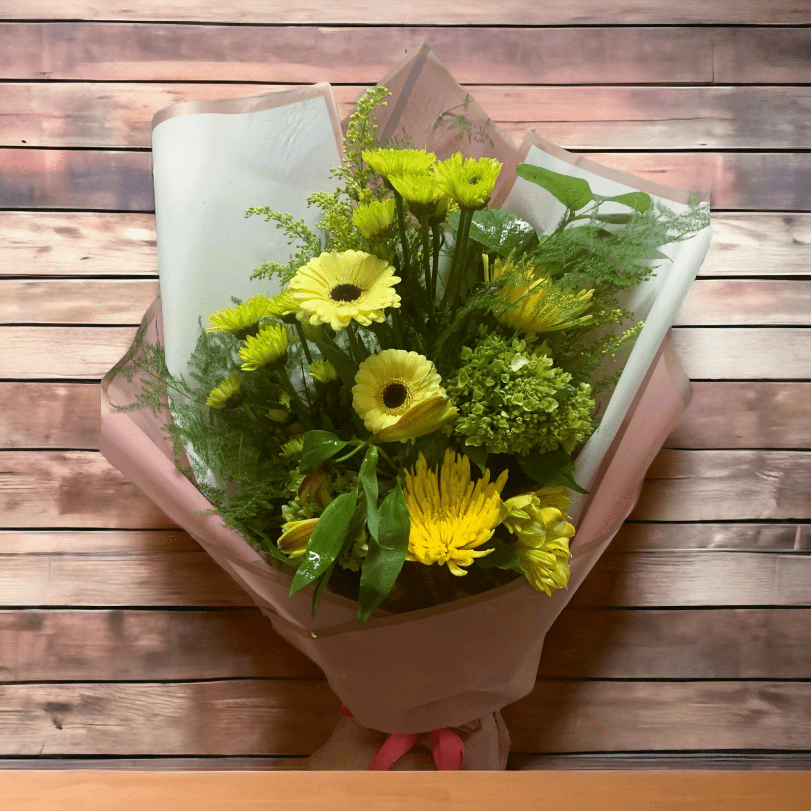 Included: button daisy, mini gerbera daisy, mini hydrangea, spider mum, alstroemeria and greenery with fancy wrapping paper.