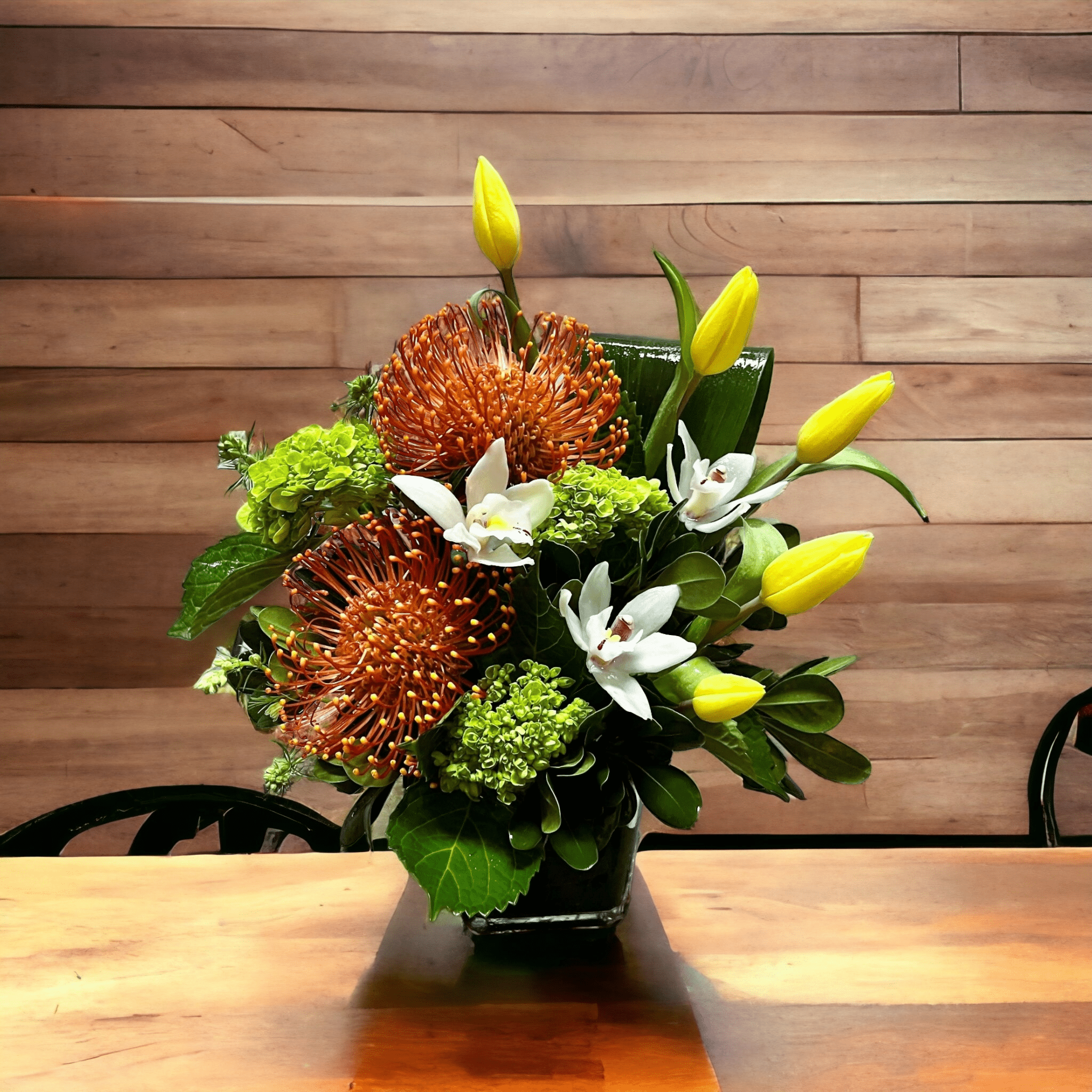 Included: pin cushion, cymbidium orchid, tulip, mini hydrangea and greenery in a clear vase.