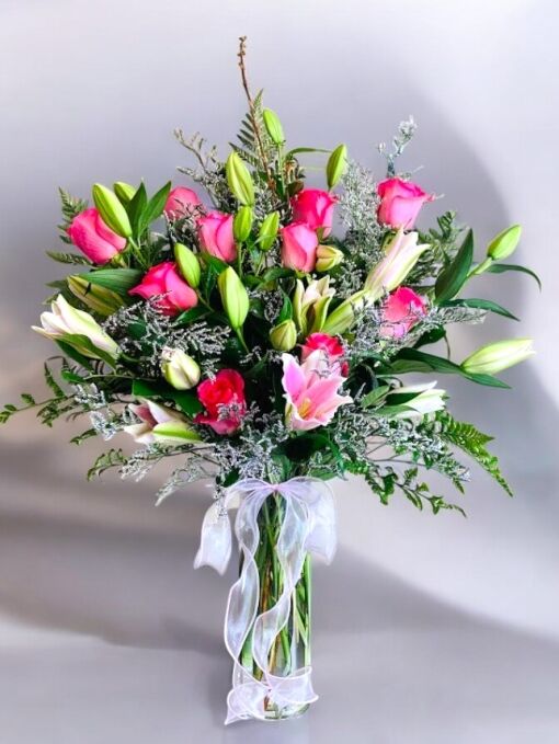 - Roses of Love: Featuring 10 exquisite pink roses and 6 stems pink Asiatic lily ( OR substitute with 3 stems of oriental lily ), the classic symbol of passion and deep love, this arrangement delivers a heartfelt message. The rich pink color evokes emotions of romance and loyalty, making it ideal for someone special.