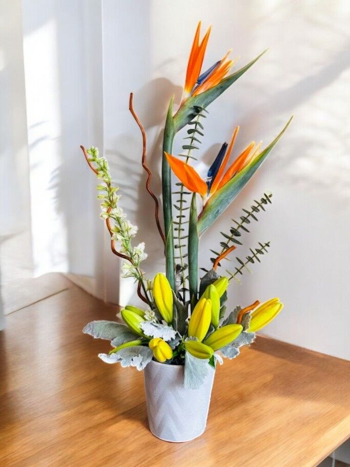 Included: bird of paradise, Asiatic lily, larkspur, eucalyptus and greenery in a container.