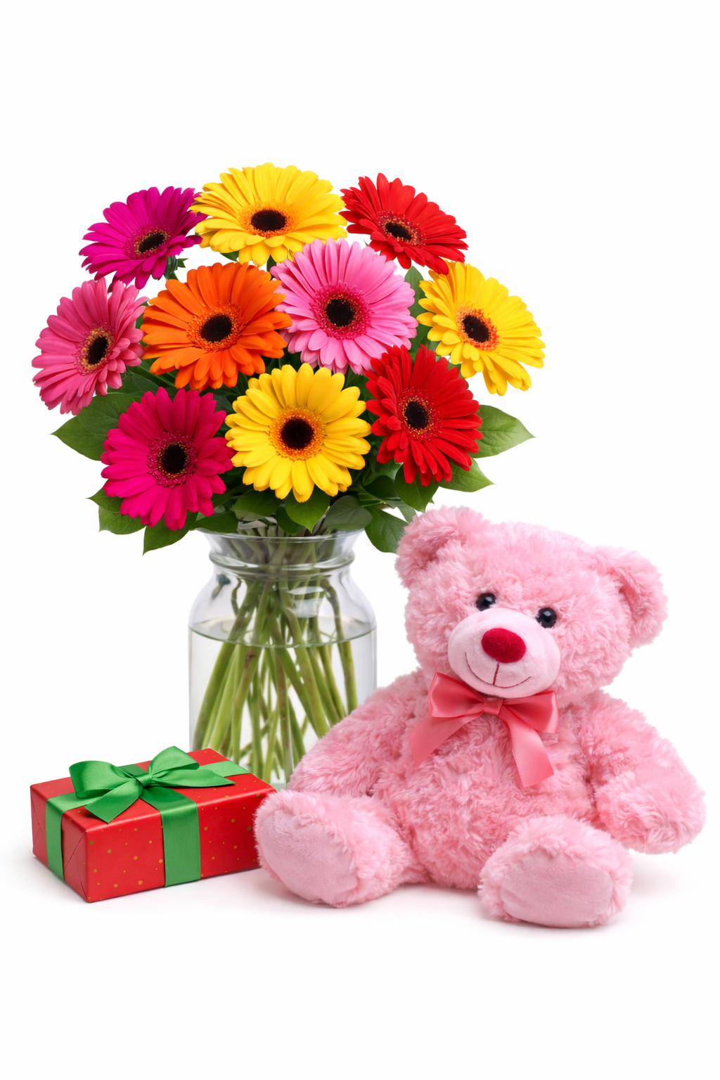 Included : 10 stems of gerbera daisy in a clear vase, plus a small teddy bear and a small chocolate box.