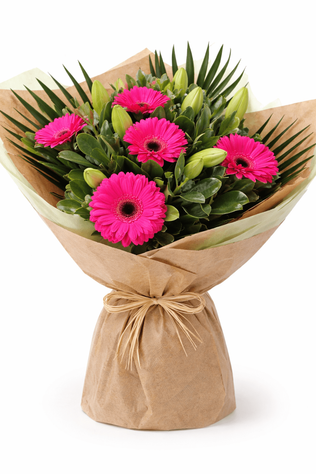 Included : 4 stems white asiatic lily, 5 stems pink gerbera in handtied bouquet with fancy wrapping paper.