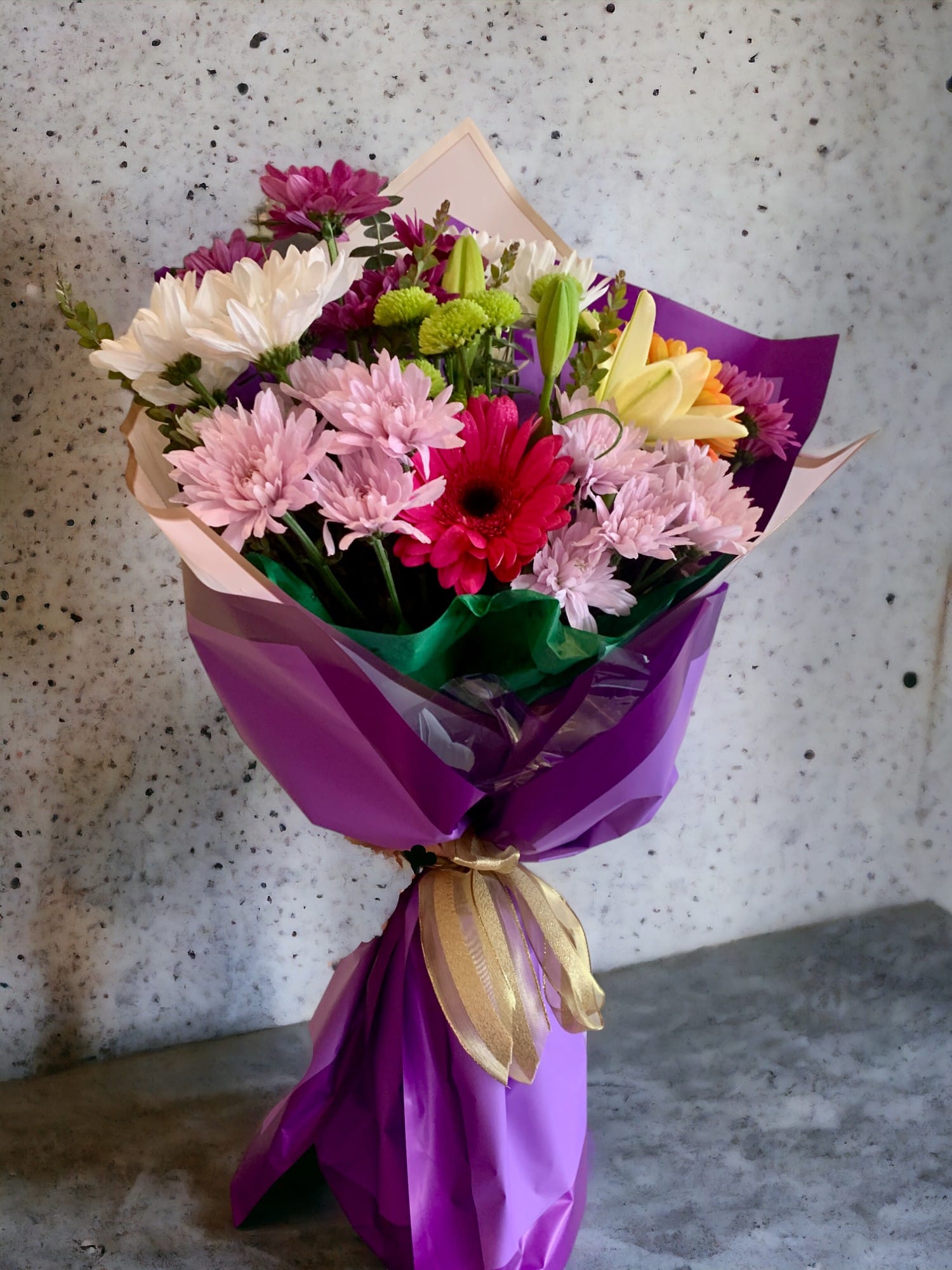 - Fancy Wrapping Presentation: Wrapped in luxurious purple and gold paper, the presentation adds an extra layer of sophistication to the bouquet. The colorful wrapping enhances the vibrant beauty of the flowers, making it a perfect gift that radiates thoughtfulness and elegance.