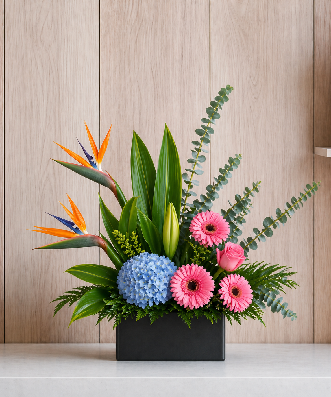 Included: rose, gerbera, bird of paradise, blue hydrangea and greenery in a metal black container.