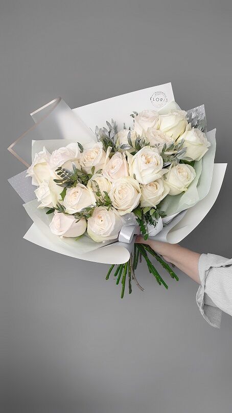 Includes : 18 white roses and greenery with fancy wrapping paper.