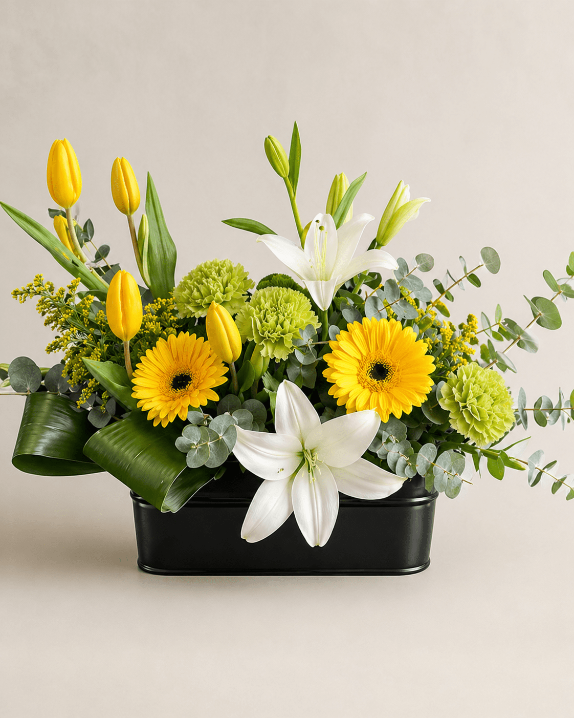 Included: tulip, gerbera, carnation, asiatic lily, solidago and greenery in a black metal container.