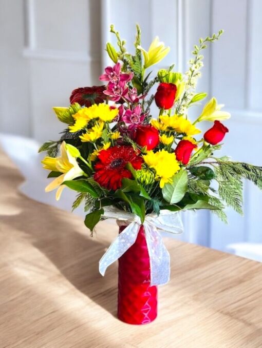 - Beautiful Presentation: The bouquet’s vivid colors and variety of flowers are complemented by fresh greenery, creating a visually stunning arrangement. The red or clear vase not only adds a decorative touch but also elevates the overall presentation, making it a sophisticated gift.