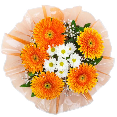 - Aesthetic Presentation: The balance between the bold orange gerberas and the gentle white daisies creates a visually pleasing arrangement. This bouquet is crafted to bring joy and light, making it a lovely gift for expressing gratitude, love, or congratulations.