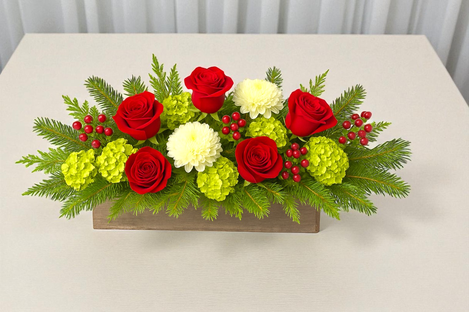 Included: 5 stems red rose, 6 stems mini green hydrangea, 4 stems hypericum berry, Christmas winter greenery in a centerpiece.