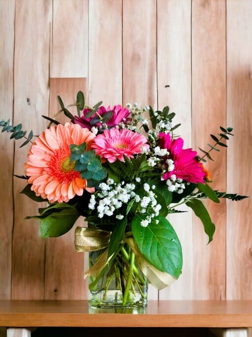 Arrangement: Gerbera daisy, mini gerbera daisy, baby breath ( Gypsophila ), eucalyptus and greenery in a clear vase