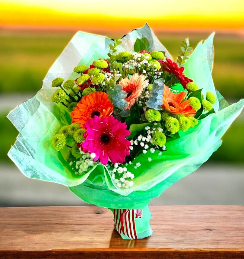 Included: 10 stems green button daisy, 6 mini gerbera daisy, baby’s breath and greenery with fancy wrapping paper.