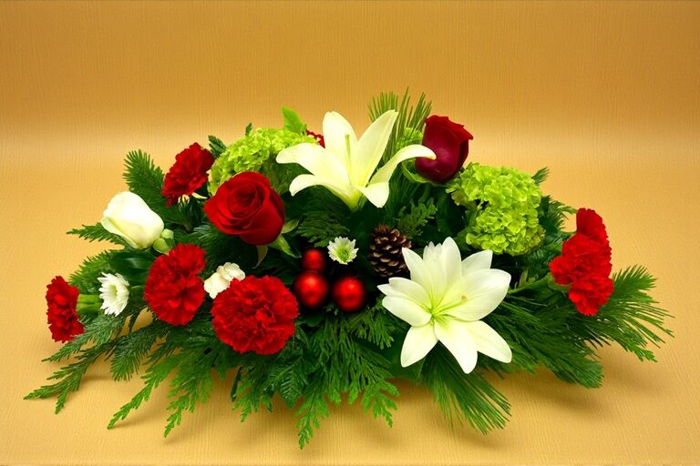 Included: 2 stems red rose, 7 stems red carnation, 2 stems white rose, 2 stems white Asiatic lily, 2 stems mini green hydrangea, 2 stems white chrysanthemum daisy, Christmas winter greenery and decorations in a centerpiece.