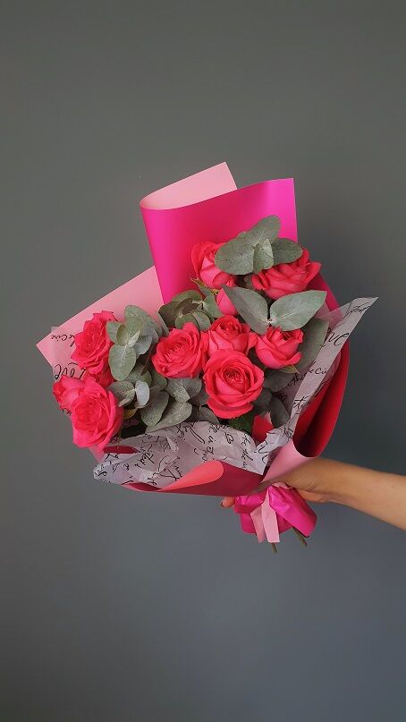 Includes : Greens, 10 stems of hot pink rose with eucalyptus greenery in fancy wrapping paper.