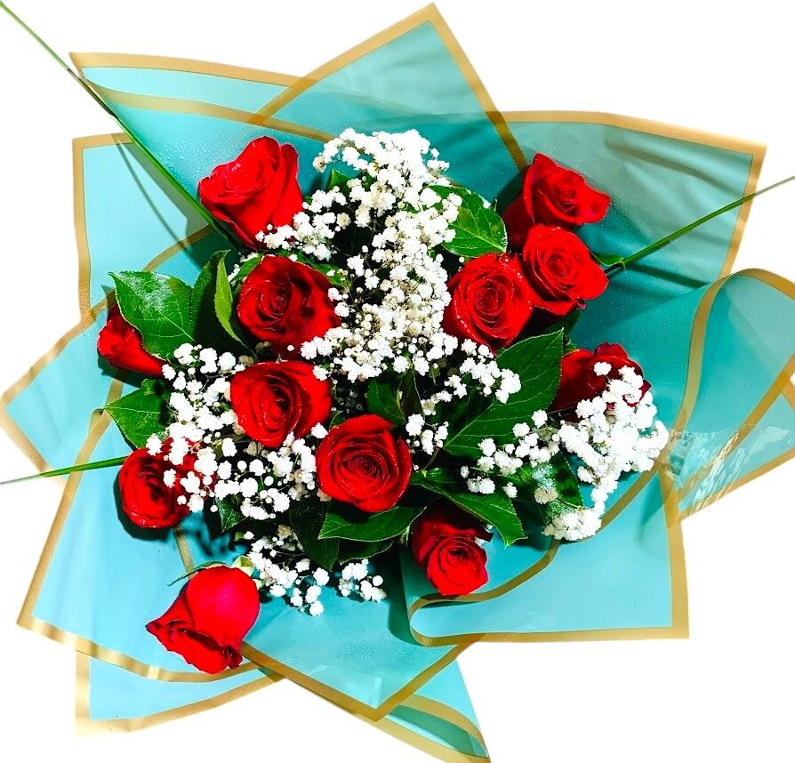 Included: 12 stems red rose with filler flowers in fancy wrapping paper.