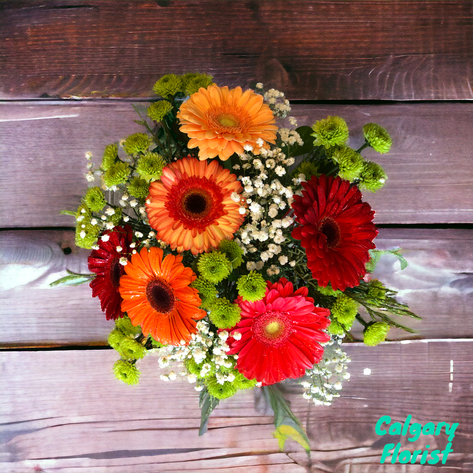 - Beautiful Fillers & Greens: Complementing the bright blooms are 10 green button daisies and delicate white baby’s breath, which adds texture and contrast to the bouquet. The vibrant greens symbolize renewal and optimism, while the baby’s breath stands for everlasting love.